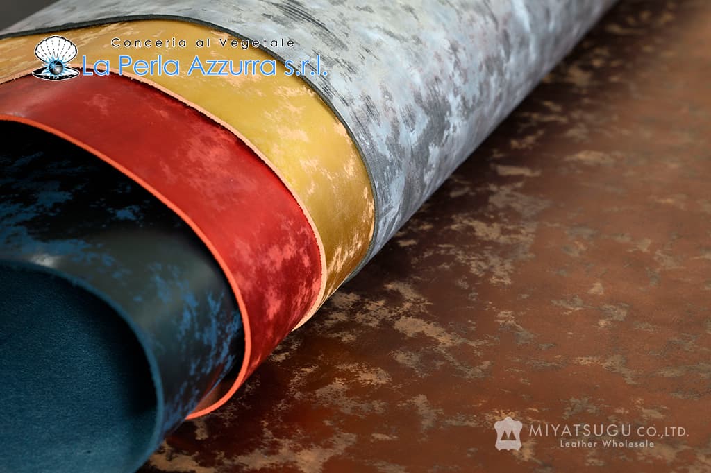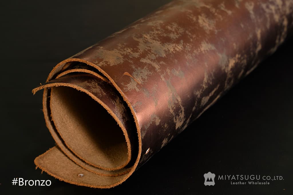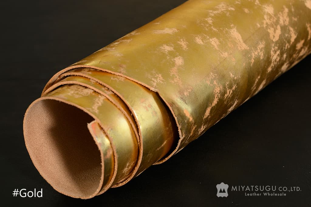 見た目にも華やかな、表面に箔を施したフルベジタブルのダブルショルダーヌメ。